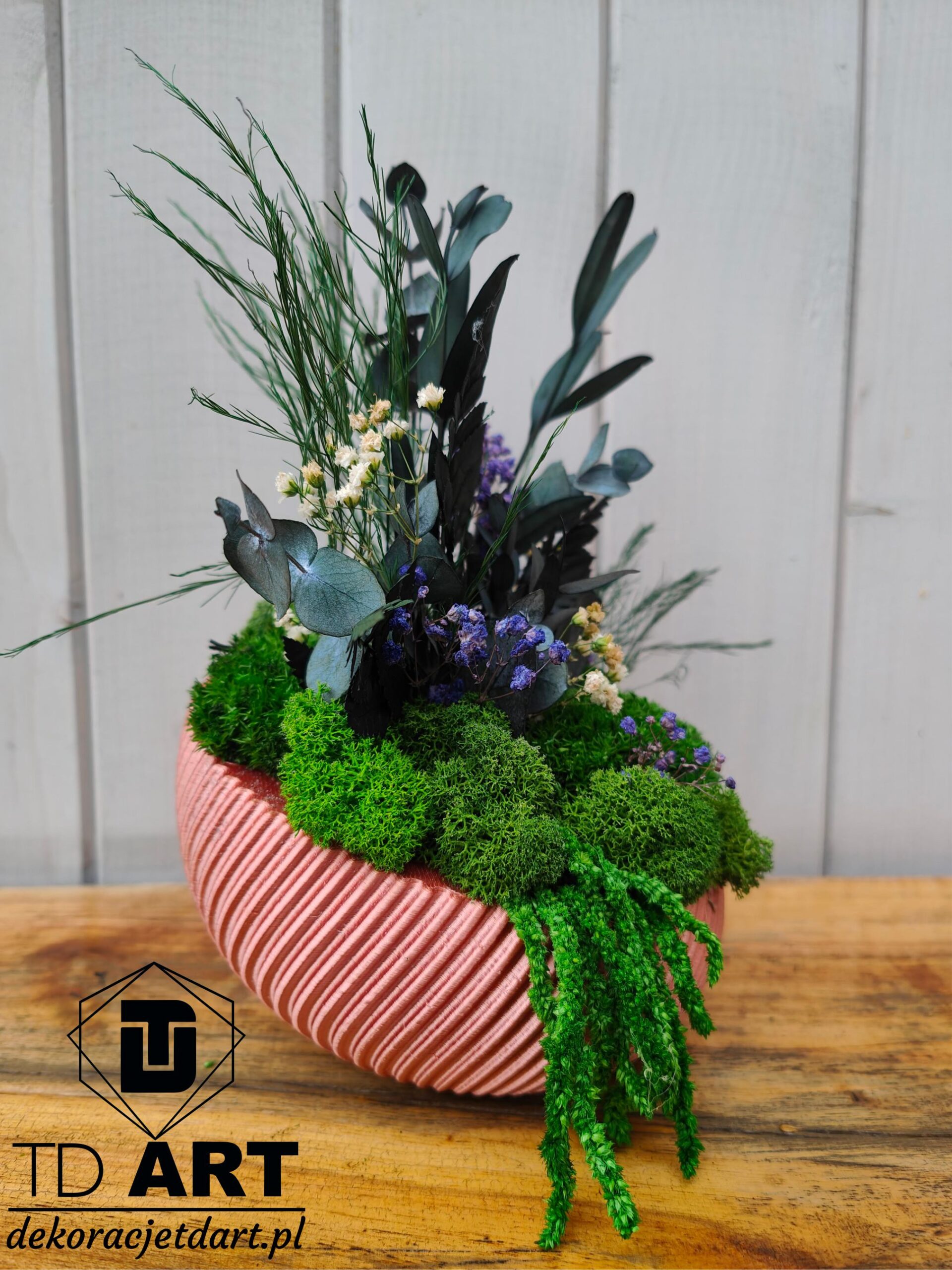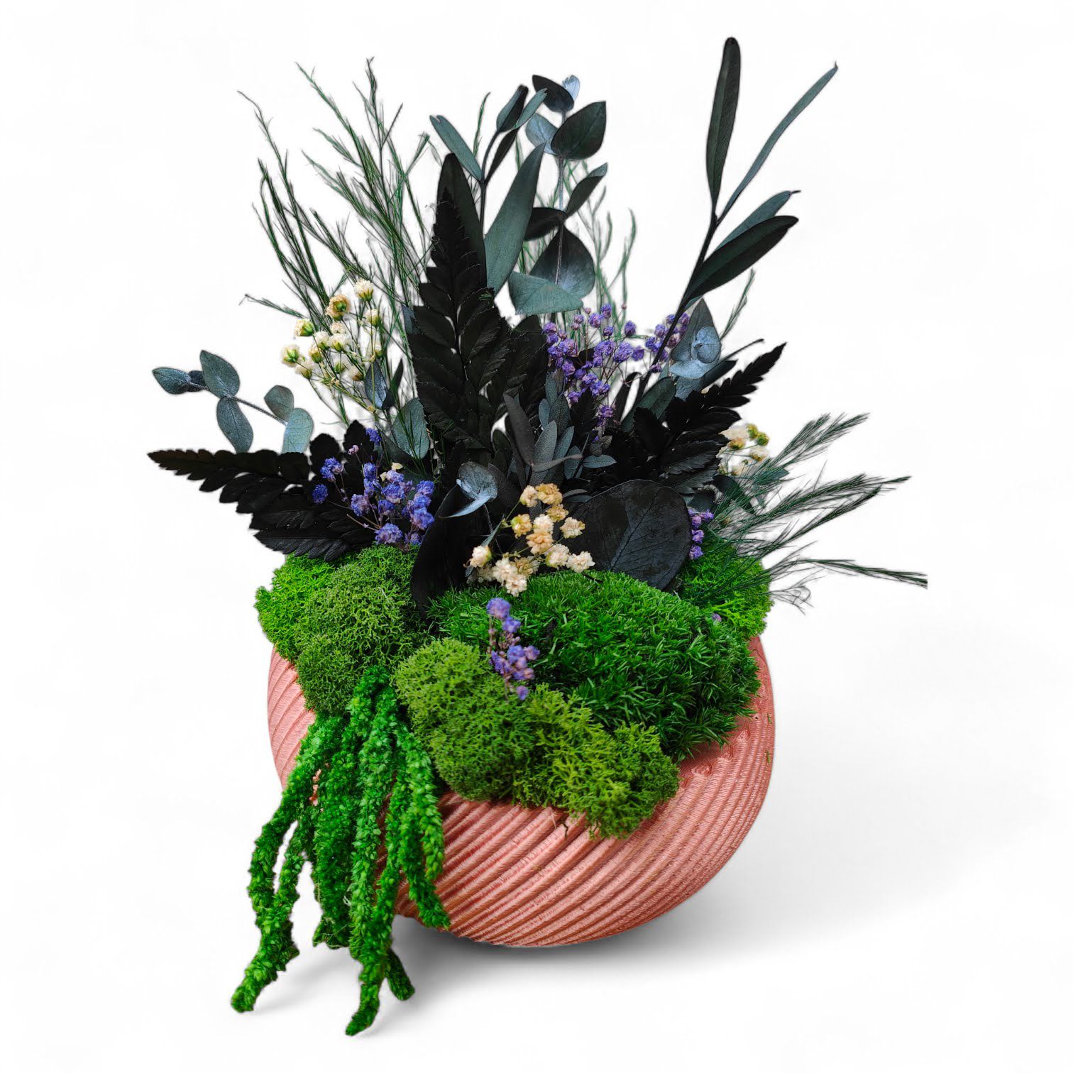 Dekoracja  “Doniczka z roślinami stabilizowanymi i mchami – miedziana ”