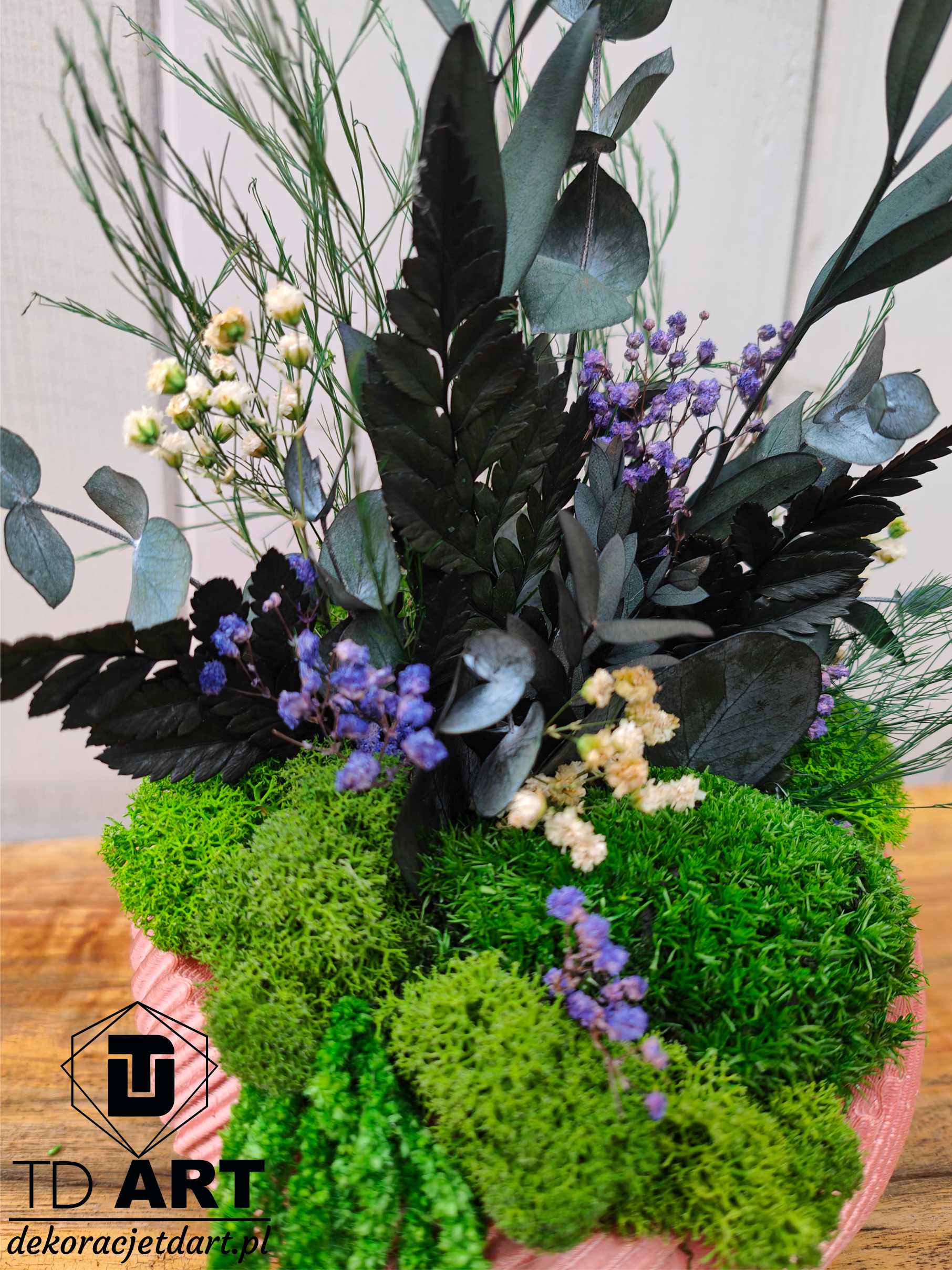 • Stabilizowane rośliny (paprocie, eukaliptus, amarantus, gipsówka), mech płaski, chrobotek i mech poduszkowy