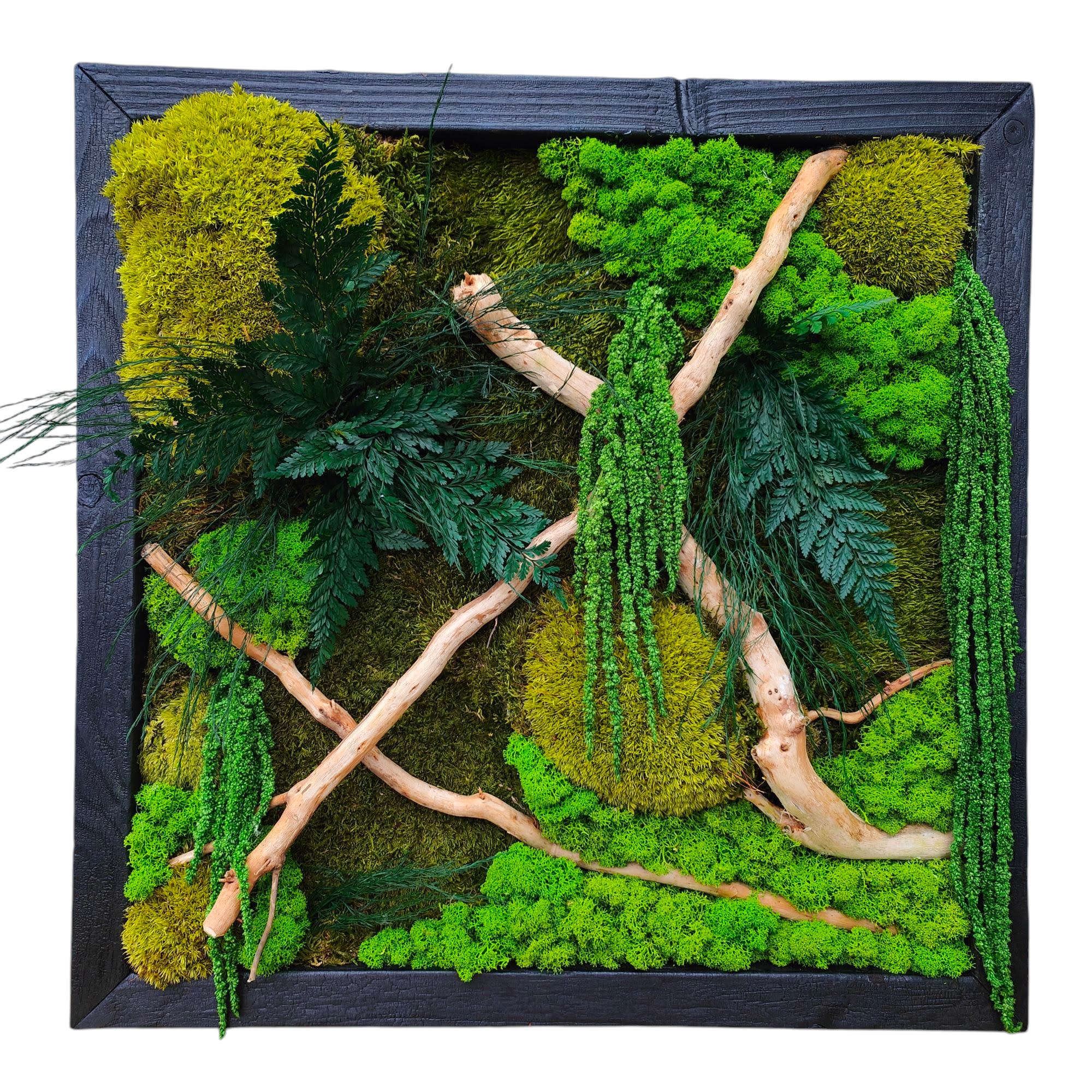 Obraz z mchami i roślinami stabilizowanymi w palonej ramie #1