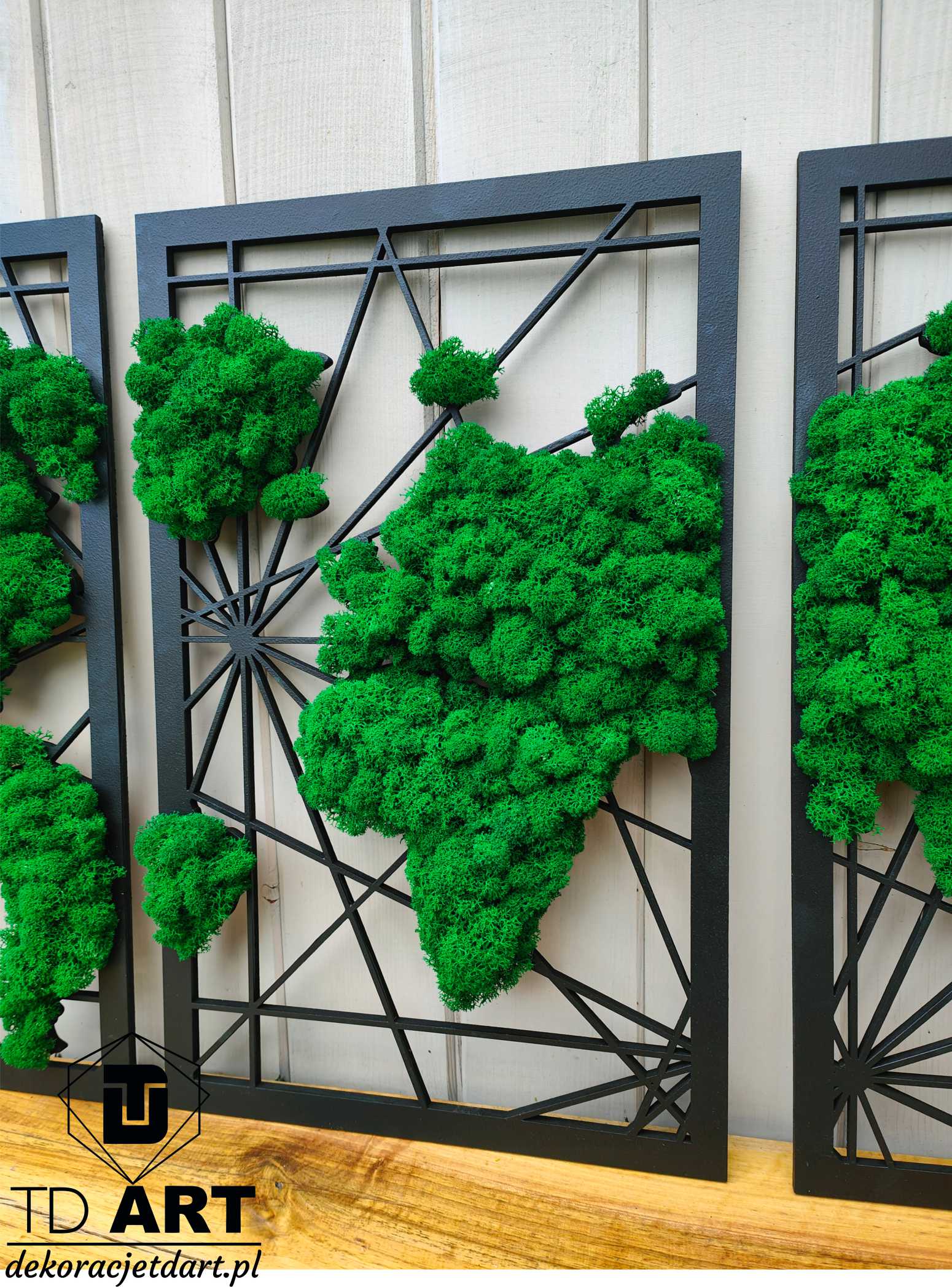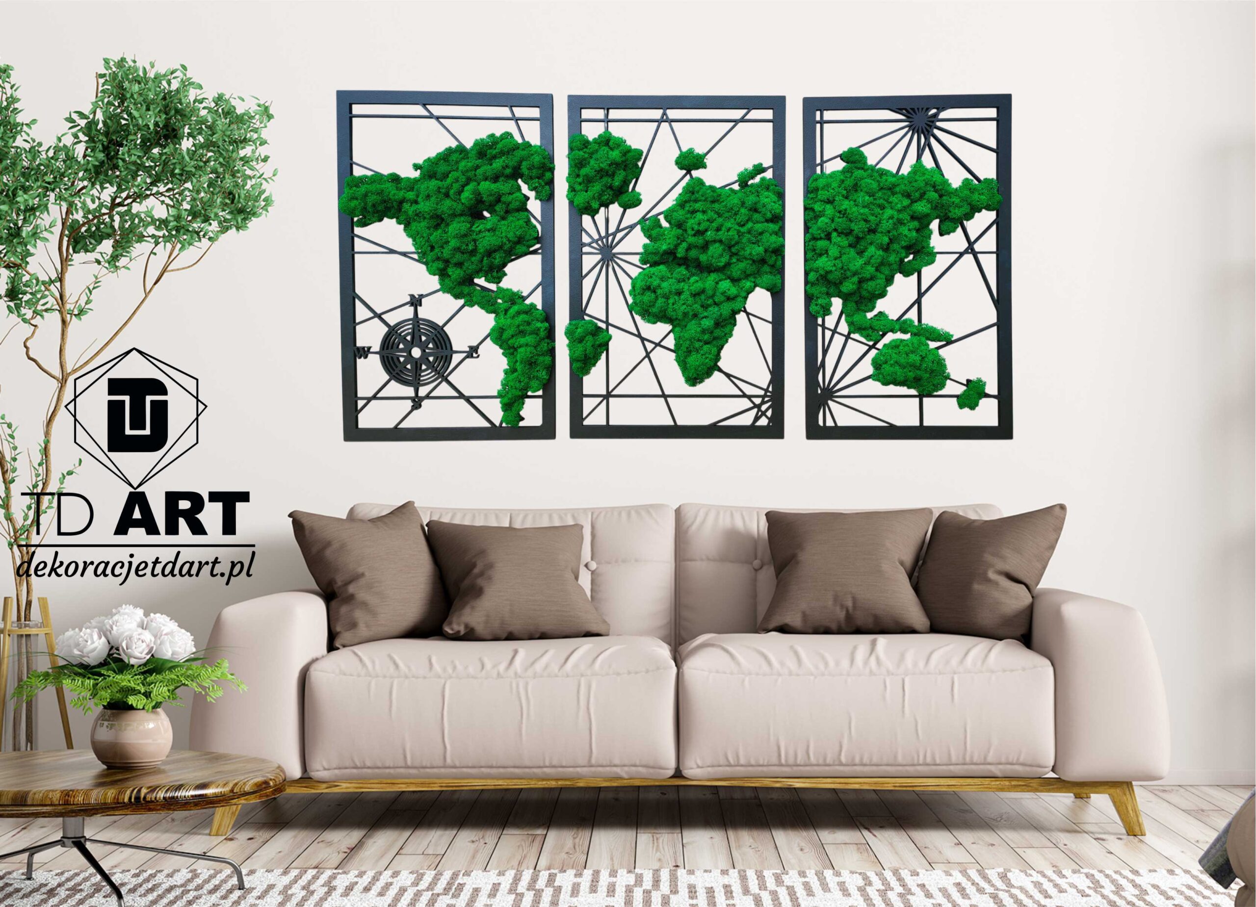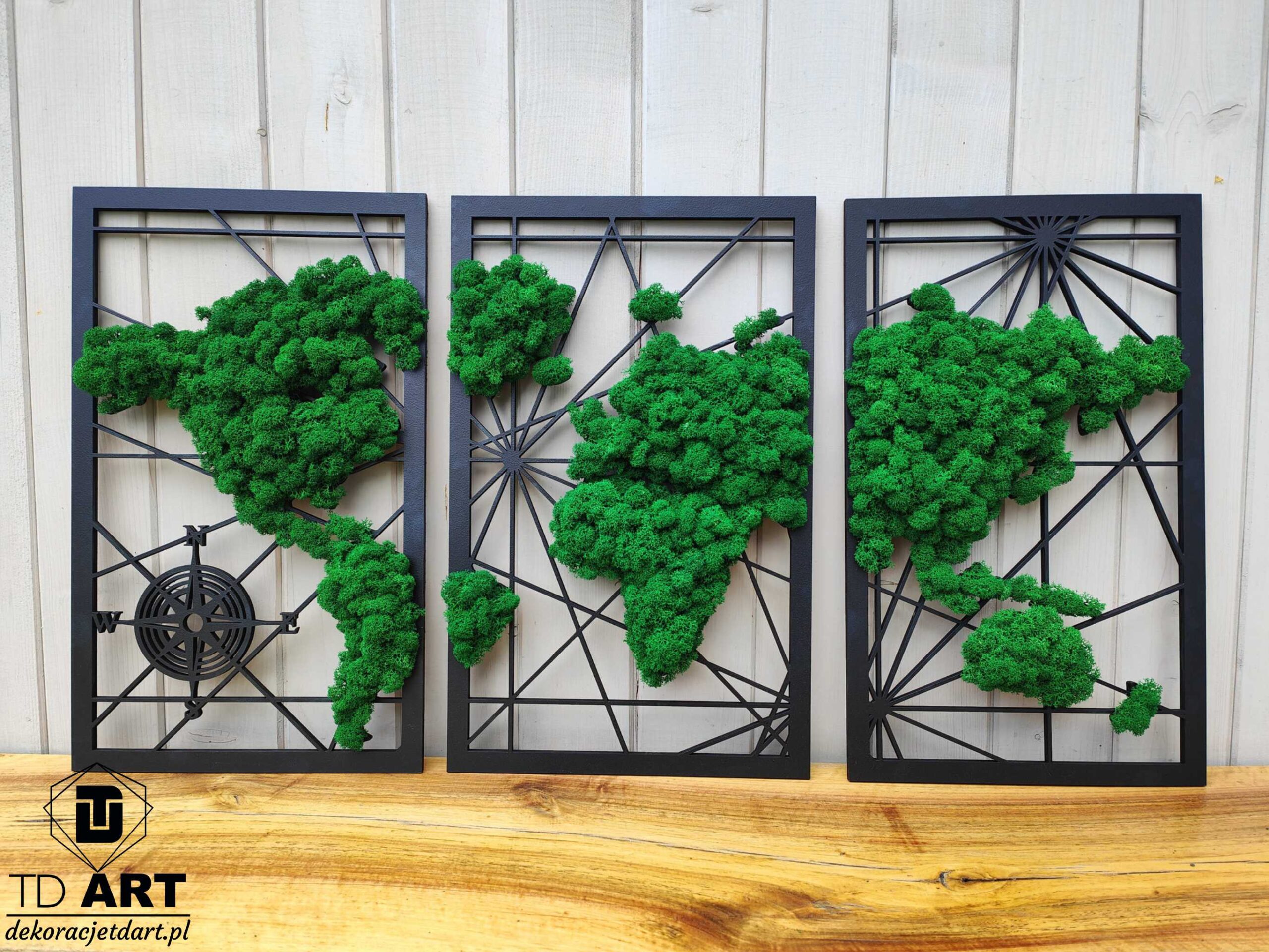 Tryptyk mapa świata z mchem chrobotkiem – 3 elementy
