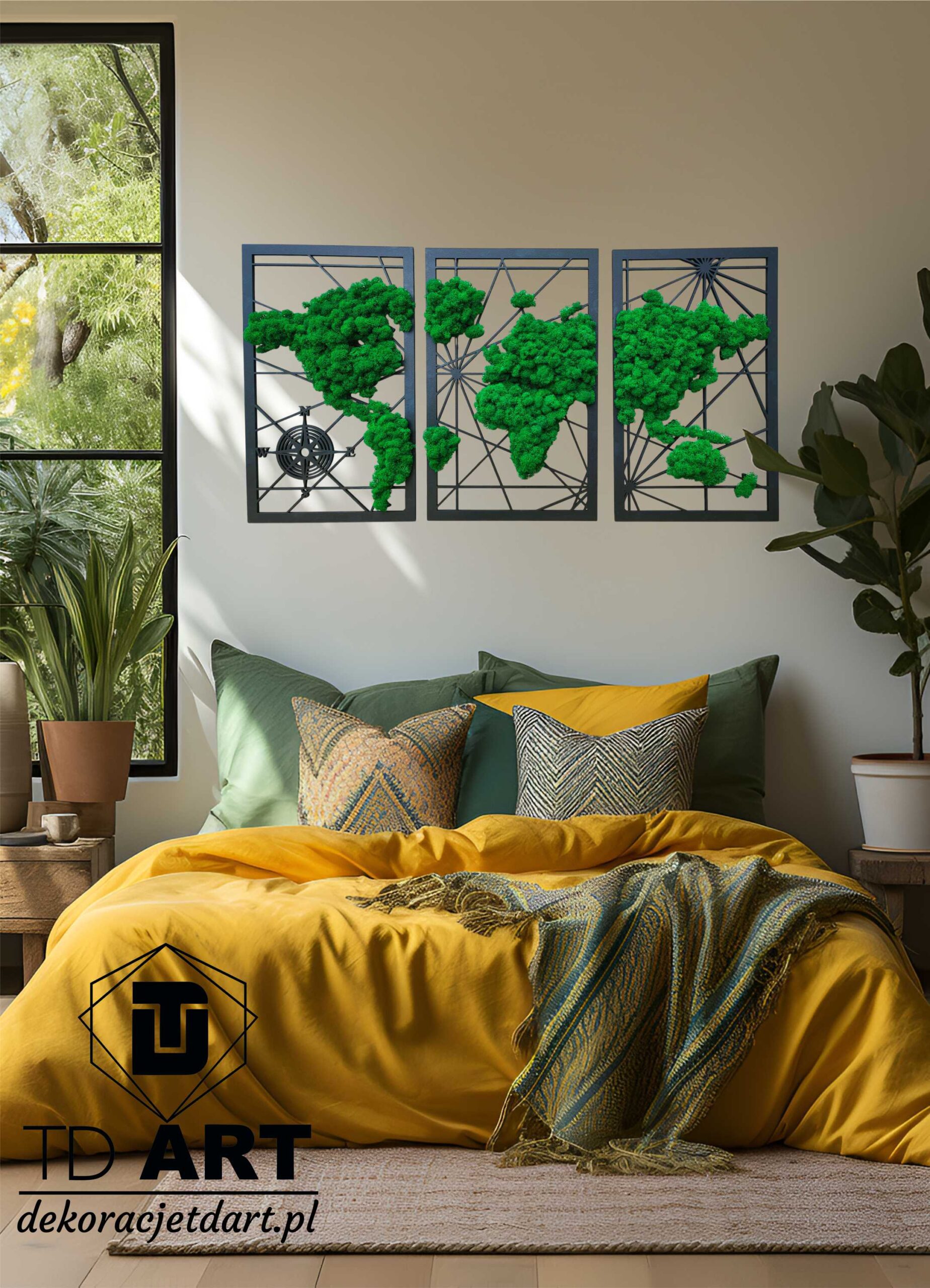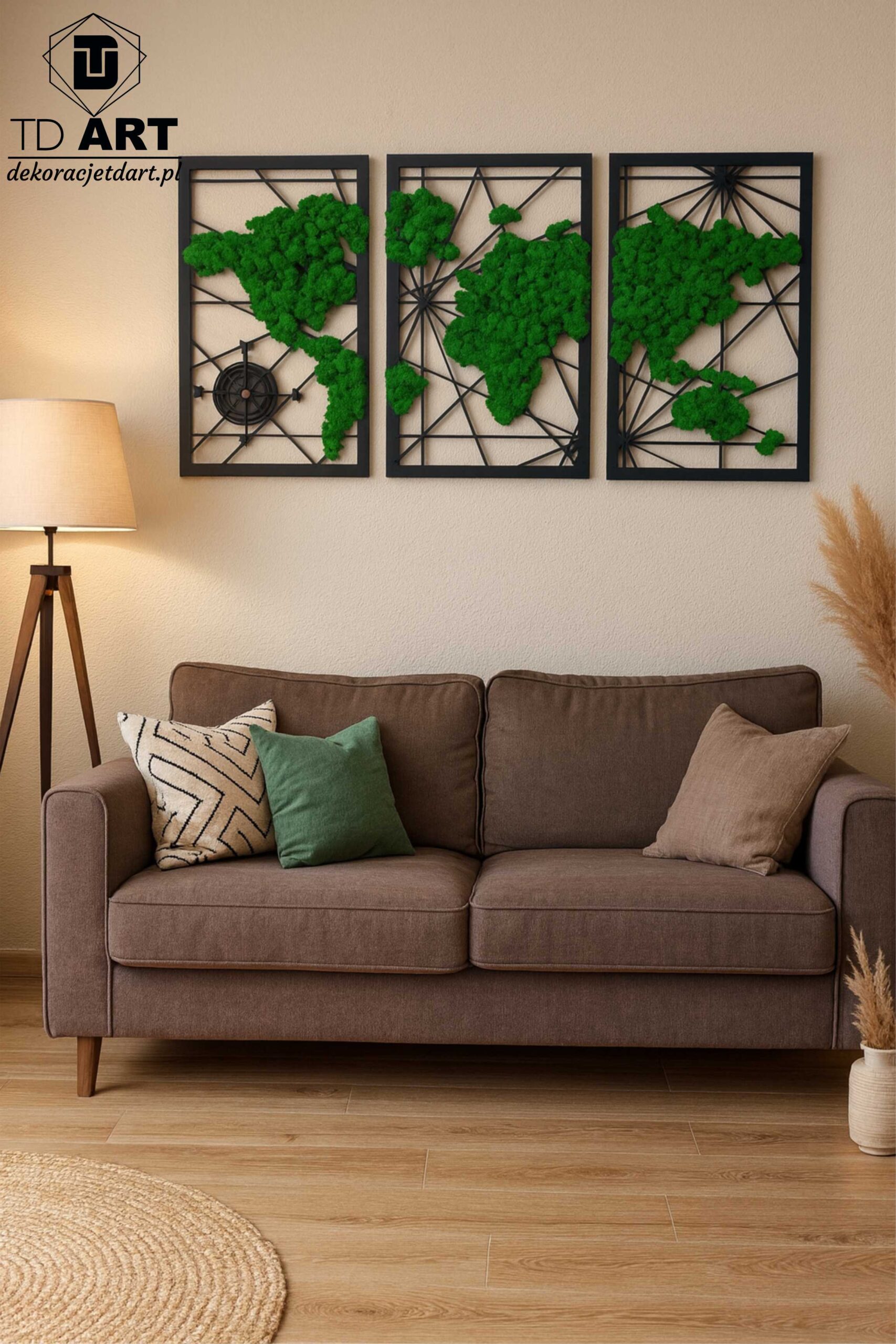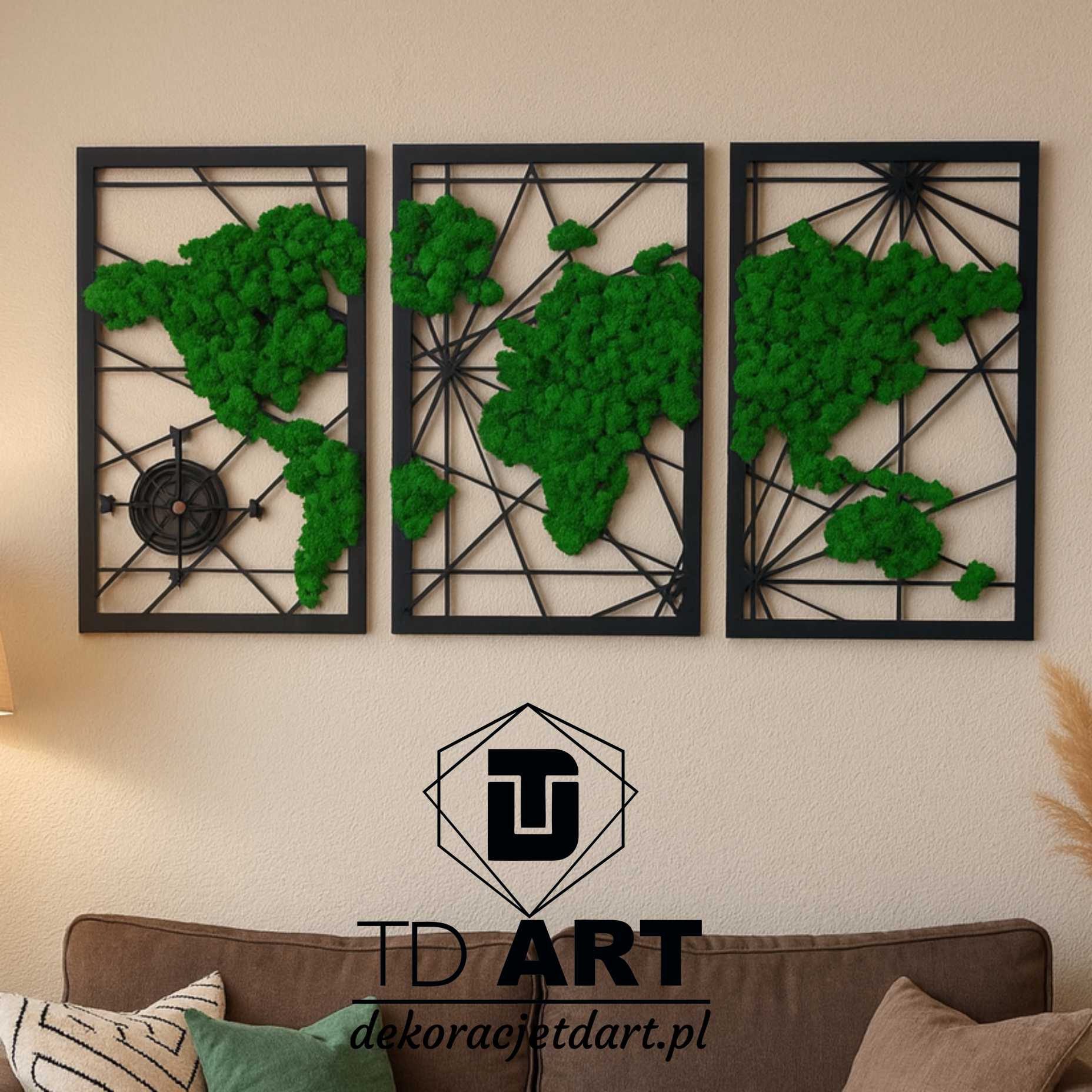 Tryptyk mapa świata z mchem chrobotkiem – 3 elementy