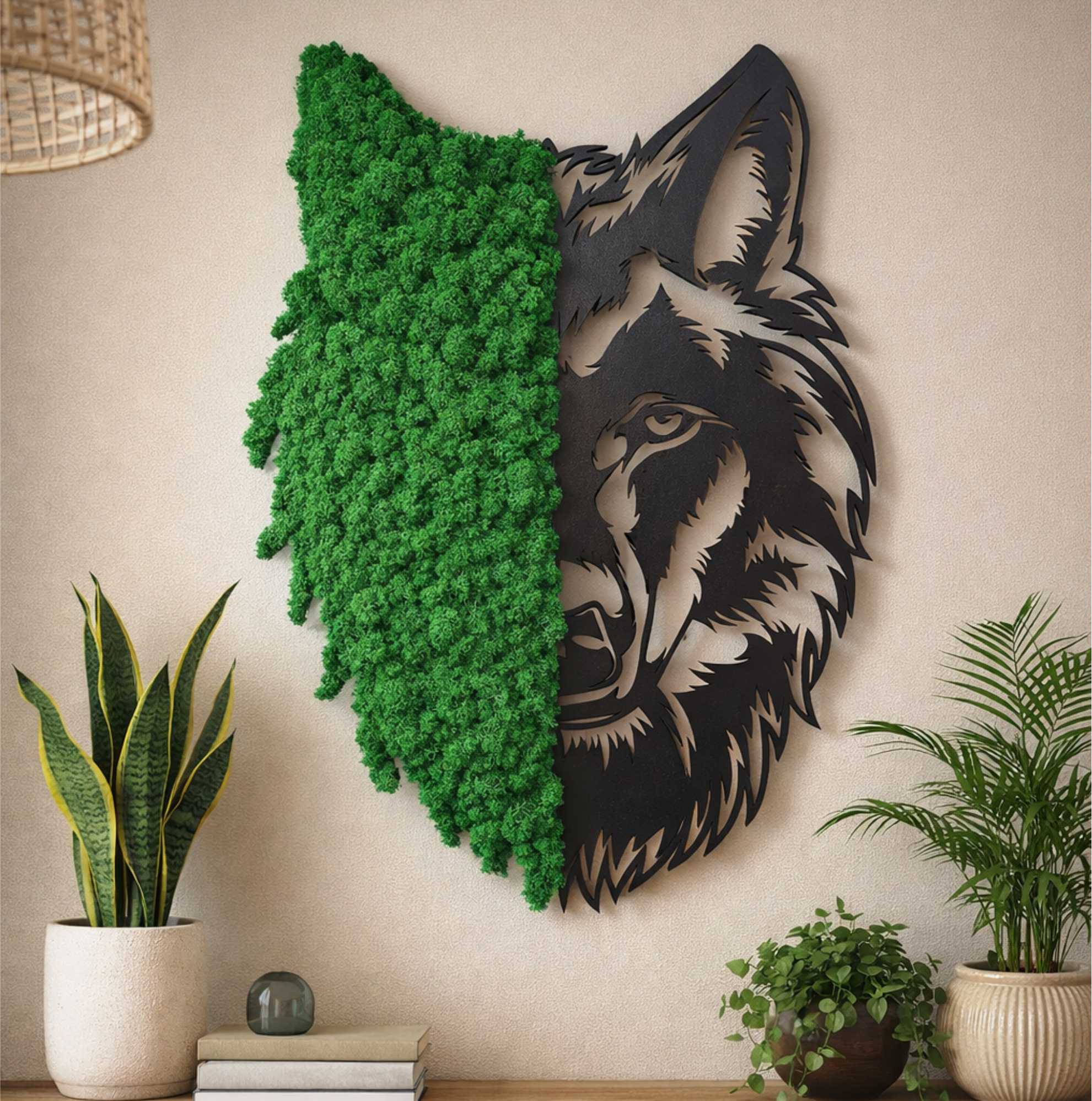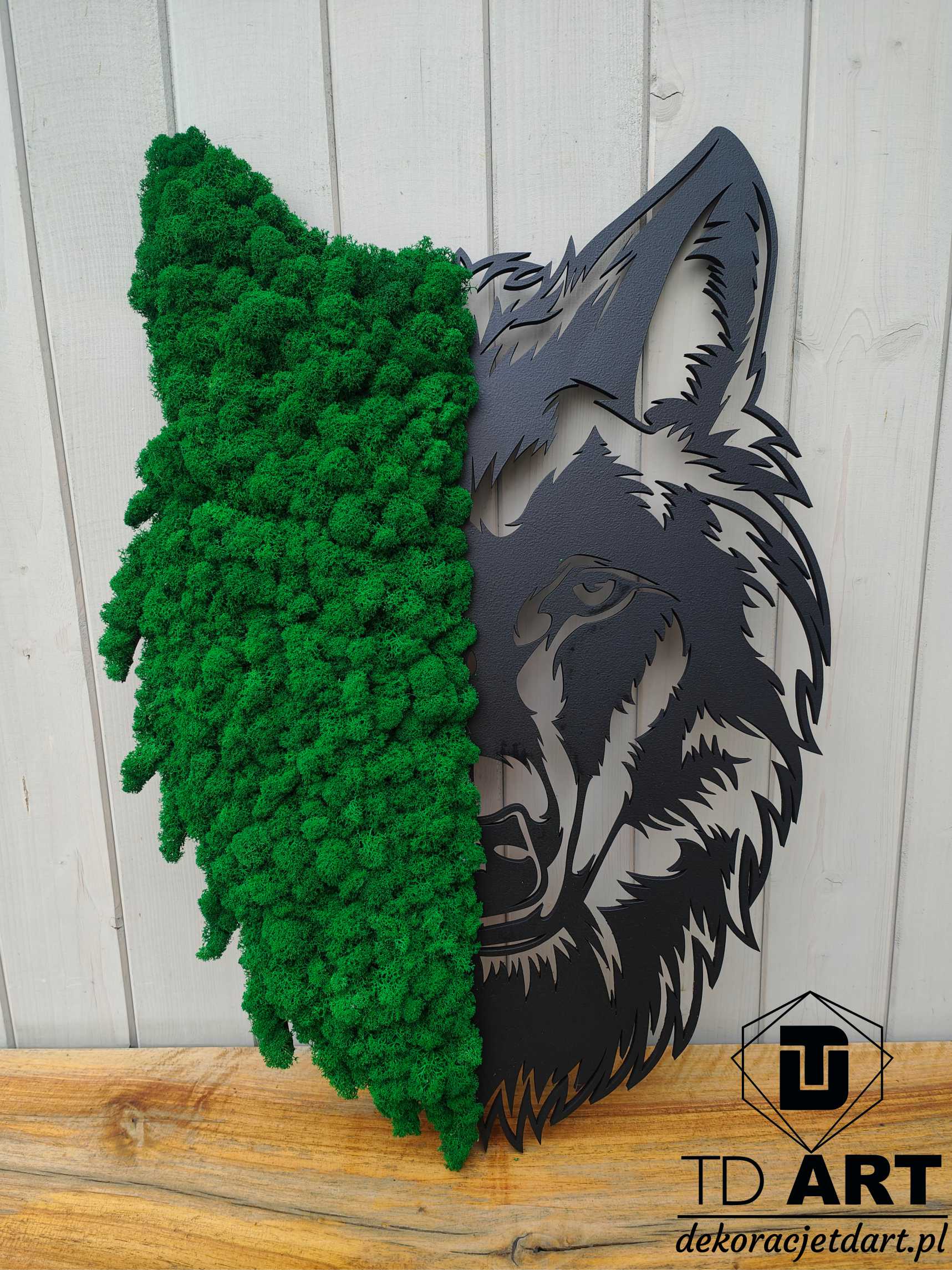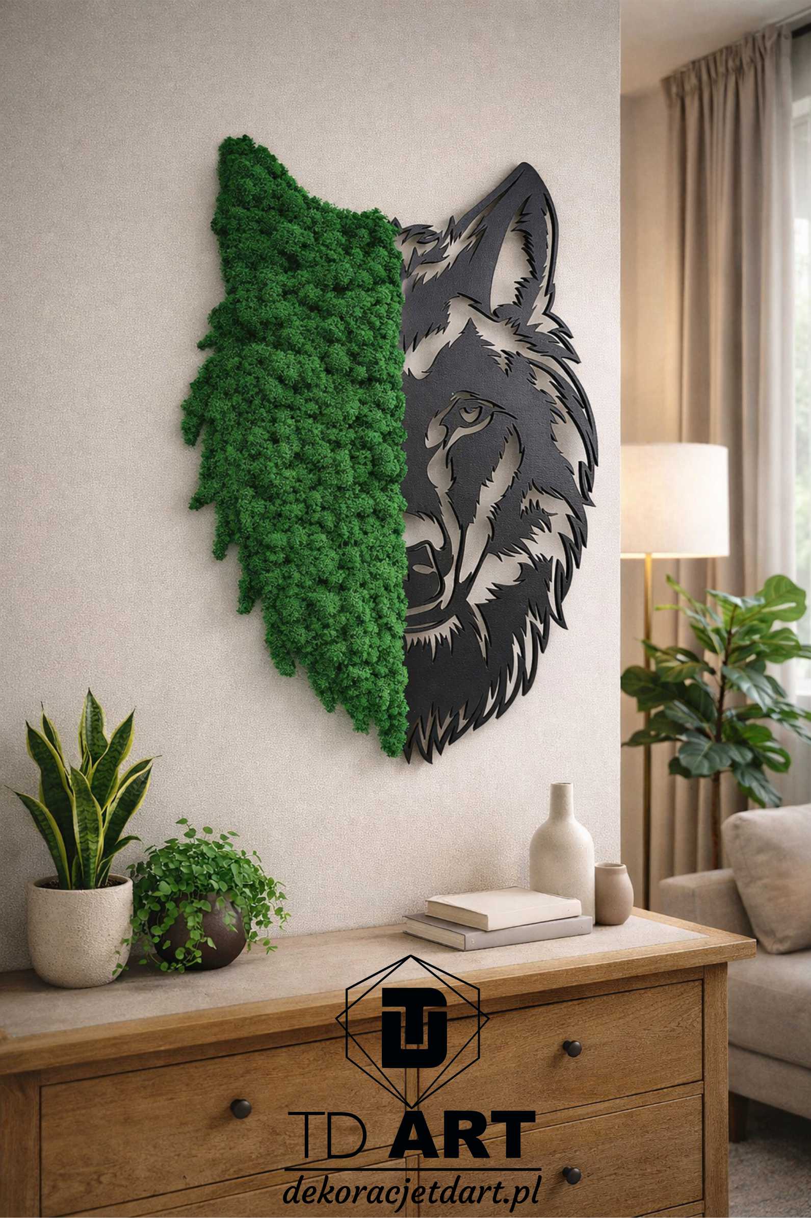 Wilk z mchem chrobotkiem reniferowym to nowoczesna dekoracja ścienna, która łączy elegancki design z naturalnym materiałem. Zielony mech wprowadza do wnętrza spokój oraz przyjemny, naturalny klimat.